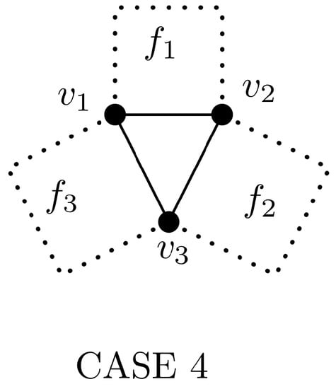 - Let f be a 4-face adjacent to an inner 3-face g and another face h.Suppose to the contrary that h is an inner 3-face or a 4-face.If h is an inner 3-face, then is a 6-cycle with two internal chords by Lemma 3 (iii), contrary to Lemma 4.If h is a 4-face, then Lemma 3 (ii) yields a 6-cycle from , which is adjacent to a 5-cycle from , a 4-cycle from , and a 3-cycle from , contrary to
