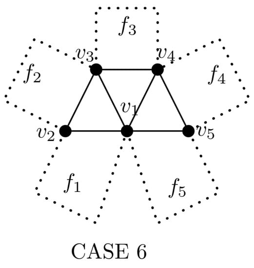 Let be a 5-cycle with two chords and . Let , be five adjacent faces of in cyclic order. Moreover, let be incident to and (i is taken modulo 5). Note that and may be the same face (See Figure 3). It follows from Lemma 5 (iv) that , , and are -faces. By symmetry, we only consider the two following cases.