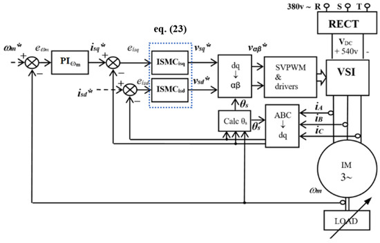 Integral sliding mode control (ISMC) has been proposed by several authors to govern distinct sectors of IM to reduce chattering. An error, as well as its integral signal, are required by the standard ISMC surface. In [25], the authors have employed the integral sliding mode technique to design an observer to be utilized as the prediction model in the algorithm of predictive current control of the IM. In [26], the integral sliding mode method is applied for the purpose of observer design while the stator currents are being regulated with sliding mode control. Moreover, in [27,28], the authors presented an ISMC approach for starting speed sensorless controlled IM in the rotating situation. Furthermore, in [21], the authors suggested an ISMC anti-windup in the mechanical regulation loop of the IM. Moreover, in [12,22], a speed regulator has been designed based on the ISMC method while the stator currents are being regulated by PI controllers. However, due to the non-linearity of the IM, a well-designed nonlinear regulator can enhance the performance of the machine when there are disturbances and uncertainty. In [28], a velocity observer based on the ISMC technique for IM has been proposed, where stator current controllers are regulated through PI controllers combining with ISMC controllers, which means more cost and nesting in the system.