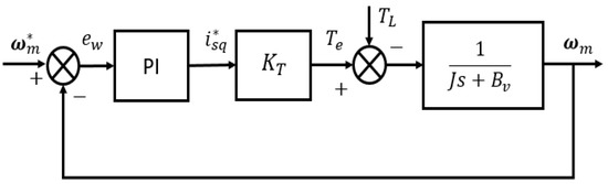 Assuming that the dynamics associated with the IM stator current controller blocks, the SVPWM and the VSI blocks are much faster in respect to the induction motor dynamics, they can be neglected [29]. Moreover, considering that the rotor flux current command, , is constant, so that we will get the simplified blocks diagram, which is shown in Figure 2. As indicated in the diagram, a PI regulator has been used to control the mechanical speed of the machine, implying that this regulator must be adjusted to get the faster dynamics as it is possible. The frequency-domain method is used to get the speed regulator’s adjusted parameters while stability being guaranteed [29].