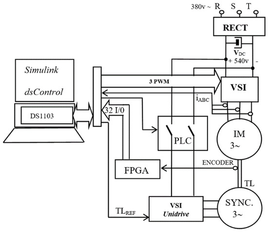 The power block is composed of a DC bus, the inverters to control the two motors, and the bank composed of the two motors. The 540-V DC bus is obtained from a 380 V/50 Hz three-phase grid, by means of a semi-controlled rectifier and a 27-mF capacitor bank. The inverter for the induction motor is a 50-A industrial three-phase IGBT bridge, and the synchronous motor is an Emerson Unidrive programmable inverter. The IGBT bridge is used as a three-phase inverter to power the stator of the induction motor, which is controlled with the functions of the Simulink SVPWM library for . On the other hand, the synchronous motor has its own Unidrive inverter, which is torque controlled with a DC voltage set-point proportional to the torque to be generated, and which is sent from the .