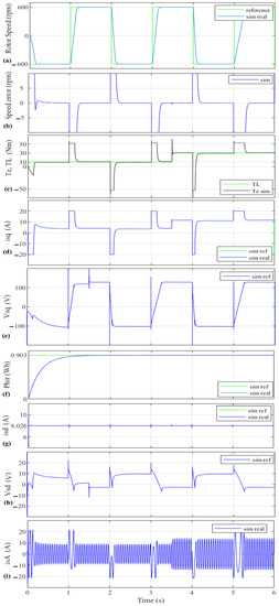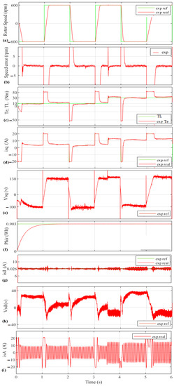 Figure 6 depicts the machine performance by using the experimental test that corresponds to the simulation test presented in Figure 5. The speed tracking and accuracy are quite close to the simulation example, and it has fast dynamics, as shown in graphs (a) and (b). In steady state, speed error is less than 1 rpm, implying good accuracy in the presence of load disturbance. By comparing the electromagnetic torque (c) its simulation scenario, it is noticeable that both are fairly comparable, smooth, and efficient. Graph (d) shows that the torque current tracking is occurring precisely, and it is very similar to the simulation case, which is obtained due to the smooth and effective output voltage of its regulator, (e) graph. It has been demonstrated that the rotor flux (f), its related current (g), and the regulator’s output voltage (h) are very similar to their respective simulation ones. Finally, one phase of the stator currents is shown in graph (i). It is worth noting that the experimental voltages () and currents () have higher control action than the simulation case due to the unmodeled dynamics of the plant.