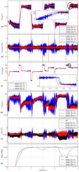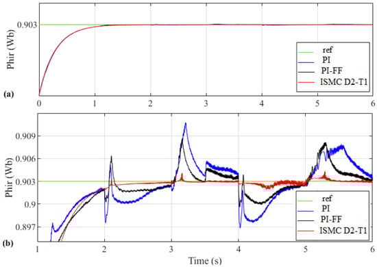 Experiments for flux performance comparison between the enhanced ISMC D2 and the PI regulators are shown in Figure 9. The ISMC regulator is correcting the effect of the current coupling terms in graph (b). As a consequence, it is getting good control over the rotor flux, whereas by using the PI regulator, the compensation is worse and the rotor flux control is not so good (losing the flux tracking at the 1 s, 2 s, 3 s, 4 s, and 5 s instants). This performance leads us to take advantage of the flux-weakening regimen, which demands high precision in the rotor flux.