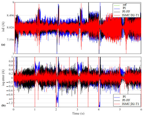 The graphs of Figure 8 and Figure 9 show the comparison of the experimental tests between the enhanced ISMC (D2-T1) and the PI current regulators by using the same speed and load conditions as in the test of Figure 5. For running these experiments, once the PI controllers have been adjusted without considering and coupling terms of currents (Feed-Forward, FF) action and once by considering FF action, which means PI regulators are running at their best adjustment condition. As has been shown in the (a) graph of Figure 8, the response is slightly smoother by using the enhanced ISMC D2 regulator in comparison to two PI controllers. Moreover, the error can be observed in the (b) graph indicates that by using the PI controller without FF, the motor is losing control at some instants (1 s, 2 s, 3 s).