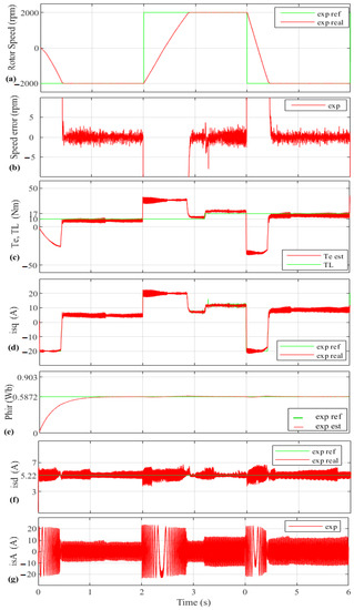 Figure 10 shows the experimental test in which the maximum value of the reference speed is 2000 rpm, which is higher than the rated value of the motor (1445 rpm, Table 2), whereas the rotor flux is lower than the rated value. This way, the machine works in a rotor flux-weakening regimen. In this experiment, the following load disturbance is applied to the regulated motor by enhanced ISMC D2 design: = 10 Nm at t = 0 s, and 7 Nm after s is added to the initial value. It can be seen that speed tracking (a) is extremely good, with an outstanding accuracy of 3 rpm of error steady-state (b). The electromagnetic torque is smooth and effective (c), with no chattering, beccause the torque current tracking is excellent (d). The rotor flux for this regimen achieves and maintains a tight, constant value of 0.5872 Wb, as shown in graph (e). This is made feasible by a precise rotor flux regulation (f), which keeps the actual current at the same level as its reference, 5.22 A. Finally, the (g) graph shows the A stator current, which shows that the three-phase currents are limited to approximately 20 A to protect the stator winding from over-currents.