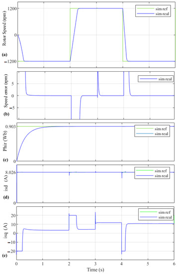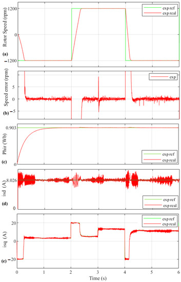 The outcome of experimental performance, which corresponds to the simulation presented in Figure 11, is shown in Figure 12. However, it is important to note that the value of factor in the real machine employed in this experiment is 60% higher than the ISMC D2 design T3 tuning case. Graphs (a) and (b) show that the speed tracking and the speed error (minor than 2 rpm) are very satisfactory. Furthermore, rotor flux has good tracking, reaching, and maintaining the rated imposed value consistently, as shown in graph (c). These good accuracy is the result of proper tracking in both stator currents, graphs (d) and (e), which present highly satisfactory and resilient tracking in the presence of significant parameter uncertainties.