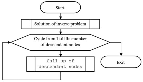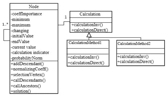 For software implementation of the graph/tree, representation in the form of a multilinked list is used. Each element of this list is an object of the node class, which is capable of referring to any quantity of ancestor nodes and descendant nodes (Figure 10). The class node for solving the problem contains a reference to the abstract class calculation. The realization of algorithms for solving the inverse and direct problems is fulfilled in inheritor class calculation. Each object of the node class contains the link to the inheritor object of the calculation class, whereby the solution path for direct and inverse problems is set as a vertex. For instance, in the method “calculationInv”, Equations (1)–(5) are iteratively realized. The methods «callofDescendants» and «call ofAncestors» are implemented for the recursive traversal of the graph/tree. The algorithm for solving the inverse problem, taking into account the constraints (Figure 4 and Figure 5), is realized in the method “solution”, which is called up during recursive traversal. Figure 10 display the basic attributes of the “node” class (“1..*” means that an object of the node class connects with at least one another object). The object-oriented architecture provides the possibility of flexible modification and expansion of the system, i.e., the addition of new factors, methods for solving inverse problems, etc.