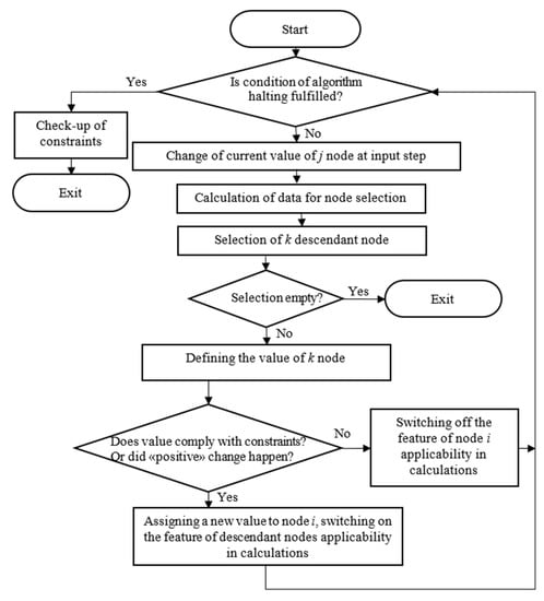 An algorithm for solving the problem based on the selection of arguments for change is presented in Figure 5. Node j is the top of the tree that represents the factor under formation in the current subproblem. In the stochastic algorithm, the calculation of data for node selection includes normalizing the importance coefficients, which act as probabilities, and the selection of the k node is accomplished by modeling the full group of incompatible events. When minimizing the sum of arguments’ absolute values, the calculation of data includes the calculation of partial derivatives, and the selection of the k node is performed by defining the maximum value of the partial derivative. The value of the k node is determined using Equations (4) and (6).