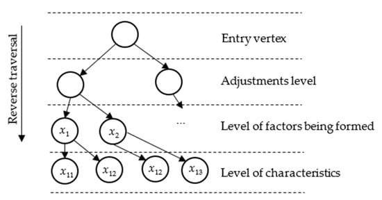 If the same characteristic is used in the calculation of various factors (for example, in Figure 1, the value x21 is used when calculating x1 and x2), an adjustment is made after finding the solution [45,46,47]. For instance, such a situation occurs when the parallel formation of the cost price of different manufacturers takes place, and this cost price, in turn, is defined by the price of the same product. In this case, an adjustment tree is developed, which includes the factors of the goal tree, and the problem is solved while minimizing the sum of squares of argument changes. The adjustment tree is created in the following way (Figure 6):