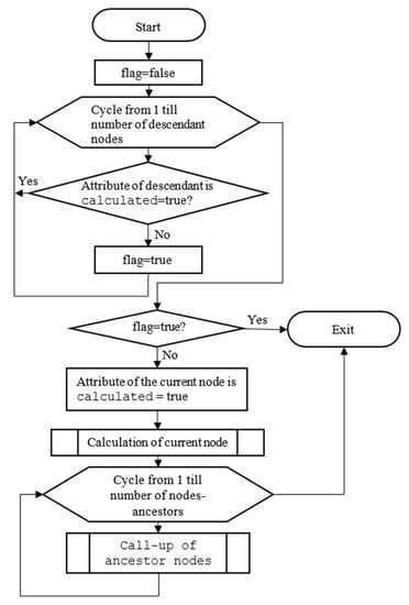 After solving the primary problem and adjustments, the task of results processing may arise, involving the calculation of new values based on existing ones, e.g., defining the total volume of raw materials on the basis of the cost price of different types of products. For this, a graph of results processing is created from the respective nodes (Figure 7). As this problem is direct, the graph is traversed from bottom to top. In this case, the nodes are calculated successively; the end node is fictitious and designed for the startup of the recursive procedure of graph traversal, which implies the calculation of the current vertex only when all its descendants are calculated. For the realization of the traversal procedure, each node has a calculated attribute. At the initial stage, the value “false” is assigned to this attribute. In the course of recursive graph traversal, a change in the attribute value to “true” takes place. An algorithm for calling up the fictitious end node is presented in Figure 8. In this algorithm, the variable “flag” is used, which adopts the value “false” if all descendant nodes of the current node are calculated (the calculation of the current node is only initiated in this case).