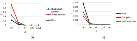 Table 3 present the results of solving the problem of profit generation, equal to RUB 160,000 (the initial value of total profit was RUB 128,718.82). The values of Euclidean distance from set values represent the values close to zero. For comparison purposes, the problem was also solved using a mathematical package. Figure 12a display the value r (depending on the parameter step α), which represents the absolute difference between the value of profit by product name calculated with the help of the algorithm and that defined using the Excel mathematical package. Figure 12b show the dependence of the difference value r on parameter α for the price, cost price, and sales volume of the first item.