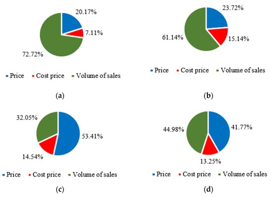 Let us also consider the solution to this problem while taking the constraints into account. For the first four items, the lower boundary of cost price was equal to 10, while the upper boundary of price was equal to 115; for the last four products, the upper boundary of price was equal to 120, while the lower boundary of cost price was equal to 15. The results of the solution are presented in Table 4. In this situation, the prices for items 2, 5, and 8 and cost prices for items 2, 5, 7, and 8 (see Table 2 for numbering) were adjusted to the boundary value. Thus, the coefficients of relative importance were corrected, and the received values of change correlation are presented in Figure 13.