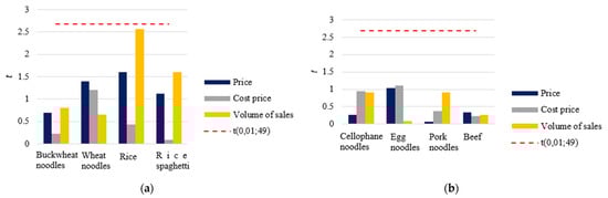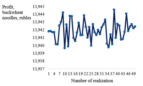 The problem of profit generation was also solved using relative importance coefficients with the help of a stochastic algorithm. The Student’s t-test was used to compare the average sample value with the set value. A total of 50 experiments were conducted for calculations. Thus, Figure 14 present the values of profit by product name with the step size equal to 10−4 (solving the problem of the first level). The problem solved using inverse calculations was taken as the set value. Accordingly, the directions of change were established (Figure 11), which enabled the increase of the resultant value while minimizing the change in the initial data (for profit by product name, price, and sales volume—positive direction of change; for cost price—negative direction of change). Table 6 present the average values, sample variance, and statistical values when solving the problem of the first level. With 49 degrees of freedom and a level of significance of 0.001, the critical value was equal to 3.5. All the calculated values of statistics were lower than the critical value; consequently, the null hypothesis regarding the equality of the average sample value to the set value was not rejected. A step reduction allowed for improving the convergence and decreasing variance. Thus, when solving the subproblems of the second level, the step size was set to 10−7, yielding a maximum variance of 1.44 × 10−5. Absolute values of the calculated statistical data are presented in Figure 15. All values were lower than the critical value for a level of significance of 0.1 (equal to 2.68). Hence, the null hypothesis regarding the equality of the average value to the set value was not rejected.