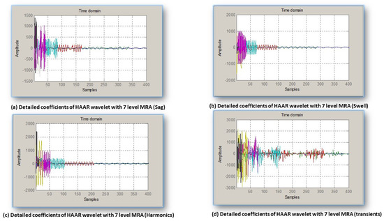 l is the decomposition level and n is the number of coefficients of detail or approximations at each decomposition level. Statistical attributes namely maximum, minimum, norm, mean values, and standard deviations of these coefficients at different decomposition levels are taken as the features. Figure 4a–d presents Detailed coefficients in a single window analyzer cumulatively for five events respectively. From this figure, it is empirical to judge that for complex events and with different multiple data sets, achieving higher classification rates from these features is a daunting task to perform. Windows for different events have been shown in Figure 4; it is empirical to judge that a clear distinction can be done by this transformation.