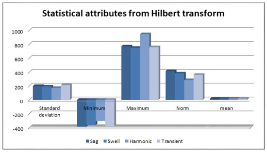 A complex signal xc(k) consists of the original signal as a real part, and its Hilbert transform as an imaginary part. In this paper, the imaginary part of the complex voltage signal is captured for different types of events, and the statistical attributes are calculated of the transformed signals. Different statistical attributes of the Hilbert transform are employed as input features to SVM. Different statistical attributes for different events are shown in Figure 5. It is empirical to judge that for the events like sag, swell harmonics and transient this feature can be the source of important information to train the classifier. From Figure 4 and Figure 5, it is judged that in many cases the performance of the classifier is based on the datasets.