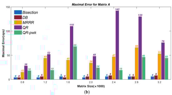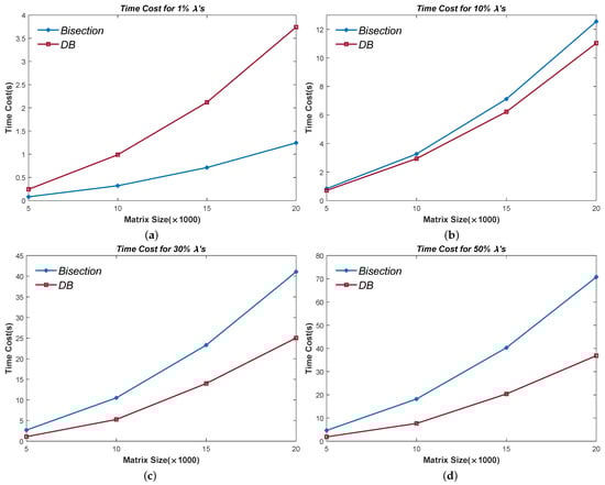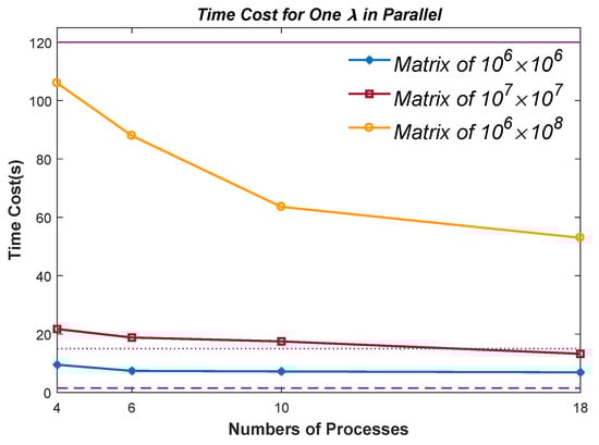 Figure 6 shows the time cost in Random Matrices of four relatively large size, i.e., , 10,000 × 10,000, 15,000 × 15,000, and 20,000 × 20,000. We calculated , , , and ’s of each size. Note the results are mean data of 40 tests, 20 for computing ’s in a certain interval and 20 for computing ’s in a certain order. Given that there is no evident difference between the test results of calculating ’s in an interval or order, we mixed them for averaging.