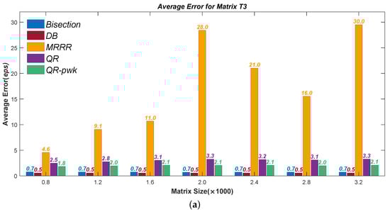 Figure 1, Figure 2, Figure 3 and Figure 4 present the test results of accuracy, where the Average Errors denote the means of errors of all the calculated eigenvalues and the Maximal Errors denote the maximum. Seven different sizes are used, from to . All errors have been divided by the machine precision for clarity. It can be seen that the new Divisional Bisection algorithm has the best accuracy as well as the Bisection method, considerably higher than the others.