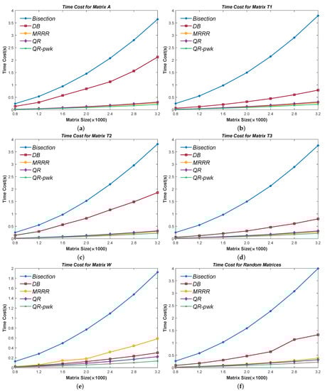 Time cost for: (a) Matrix A; (b) Matrix T1; (c) Matrix T2; (d) Matrix T3; (e) Matrix W; (f) Random Matrices.