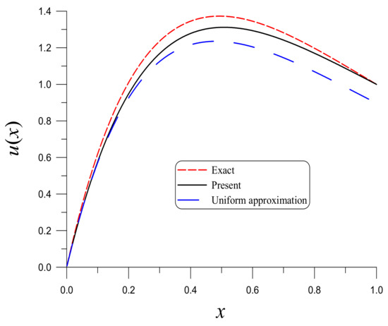 Given , and , Figure 1 compares , and the present result u in Equation (27), where the maximum error (ME) of is and the ME of is . The present u in Equation (27) is closer to the exact solution than that of in Equation (18). In Table 1, we compare the ME1 of and the ME2 of for different values of , which are close when . For , ME1 is smaller than ME2. Equations (27) and (18) possess the same asymptotic property, since