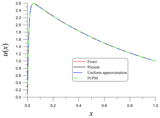 This means that the asymptotic solution does not match the right-end boundary condition in Equation (4), which has an absolute error . When is small, the error is negligible; however, when is a moderate value, the error cannot be neglected. Thus, it may induce a large error of the original asymptotic solution (18) in the entire domain.