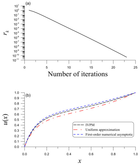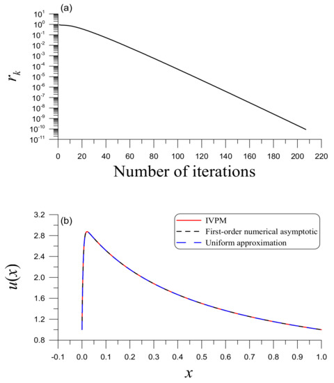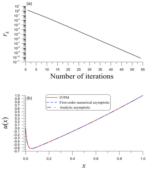 We give , , , , and and apply the iterative algorithm in Section 4.3 to find the first-order asymptotic numerical solution of Equation (119), which converges within 125 iterations, as shown in Figure 6a. In Figure 6b, we compare the asymptotic numerical solution to the exact solution obtained from the IVPM, and we can observe that they are almost coincident with ME. Notice that ME.