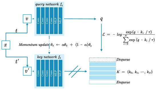 Specifically, for a given sample and the distribution of its data augmentation methods, the data augmentation methods and are adopted respectively to generate two different augmented views of the same instance, denoted as and , and treat these two as a positive pair. Input to the produces a query batch , and input to the produces the features in the queue. It uses a dynamically updated queue to store the representations of multiple batches recently used for training. After a new batch enters the queue, the oldest training batch is out of the queue, thereby maintaining a large number of negative samples to help model training. For a given set of queues, contains N + 1 encoding keys, where the encoder produces a positive sample for the current , and the others are negative samples, thus transforming the contrastive learning task into positive and negative samples corresponding to a given query . Finally, InfoNCE [27] is used as the loss function: