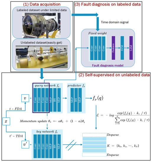 Unlike the above algorithms, self-supervised learning provides a new solution [11]. From the perspective of data, self-supervised learning can automatically extract meaningful features from unlabeled data for fault classification, thus making full use of the easily available unlabeled data from different sources [12,13,14,15]. From the perspective of computational efficiency, self-supervised learning can be applied to various downstream diagnostic tasks with only fine-tuning after the training is completed [16]. There is no need to reuse unlabeled data for training on various downstream tasks, so that different downstream diagnostic tasks can be quickly solved.