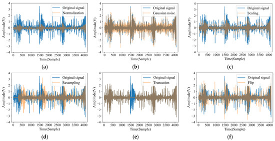 Data augmentation of sampled signals. (a) Normalization; (b) Gaussian noise; (c) scaling; (d) resampling; (e) truncation; (f) flip.
