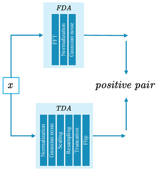 Since the signal naturally has multi-modal characteristics, our proposed SML treats the time-domain signal and the frequency-domain signal using fast Fourier transform (FFT) as a positive pair, as shown in Figure 4. If the model can correspond the augmented time-domain signal to the augmented frequency-domain signal, it can characterize the signal more comprehensively from both the time-domain and frequency-domain dimensions. Specifically, according to the characteristics of the time-domain signal, the order of normalization, Gaussian noise, scaling, resampling, truncation, and flip is used as the data augmentation method, which is called time-domain augmentation (TDA). For the frequency-domain signal, the order of normalization and Gaussian noise is used as the data augmentation method, which is called frequency-domain augmentation (FDA).