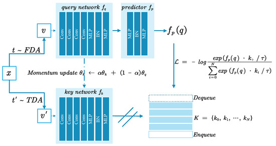 Given a vibration signal , the data augmentation distribution of the time-domain signal is TDA, and the data augmentation distribution of the frequency-domain signal is FDA. By adopting the data augmentation strategies and for , two augmented time series and are generated. For , use the query network to output the feature , and then use the predictor to predict to get . For , the key network outputs . Therefore, for a given queue, for , except for , which is a positive pair, all other features in the queue are negative pairs. Its loss function is formulated as:
