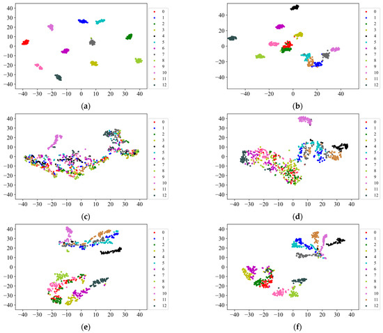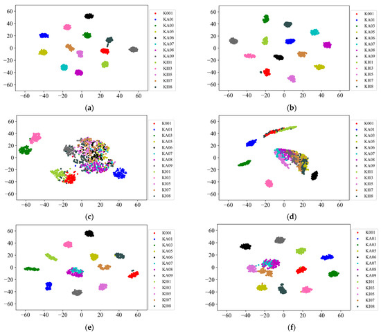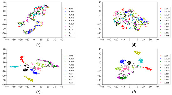 The visualization of feature extractors on labeled aero-engine bearing dataset 3. (a) SMoCo; (b) labeled pretraining; (c) Wang; (d) SimCLR; (e) BYOL; (f) MoCo.