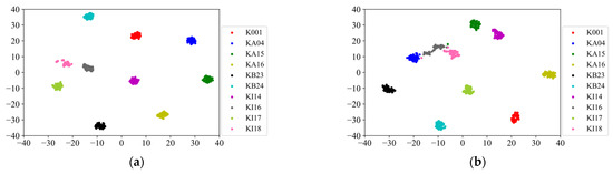 Other self-supervised learning methods, Wang, SimCLR, BYOL, and MoCo, are carried out for comparison. To exclude the influence of other factors, the backbone network of all methods is ResNet18, which is trained using time-domain signals. In addition, to prove the great superiority of SMoCo, as a comparison, the labeled dataset 1 is used for supervised learning, and the network structure is also ResNet18, which is called labeled pretraining. The feature extractors of all methods, that is, the convolutional layers of ResNet18, are used to perform feature extraction on part of the data in dataset 1 and T-SNE is used to reduce it to 2D for visualization. The results are shown in Figure 8. SMoCo can achieve an excellent feature extraction performance without using labels and achieves the aggregation of each category and the separation of different categories from each other, which greatly exceeds all other self-supervised learning methods, even reaching the level of labeled pretraining. Other self-supervised methods perform poorly, specifically for Wang, which only identifies the corresponding data augmentation categories without instance-level self-supervised learning and therefore does not perform feature extraction well. For SimCLR, its reliance on learning in large batches, via comparing data within a batch without other techniques such as momentum updates, makes its training less stable and less performant. For BYOL and MoCo, although they achieve relatively good results without labels, they lack the unique SML proposed in this paper, so the results are not as good as SMoCo.