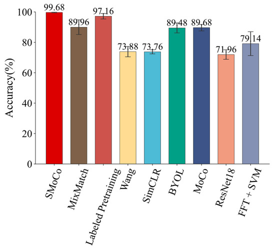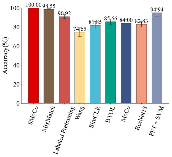 To more fully demonstrate the superiority of our method, in addition to the methods in Section 4.1, we also use MixMatch [31], ResNet18, and FFT + SVM as a comparison for the diagnosis task. Among them, MixMatch is one of the best-performing semi-supervised methods, which uses the unlabeled dataset 1 and the training set of dataset 2 for training. ResNet18 is trained using only the training set of dataset 2. The diagnostic accuracy of each method is shown in Table 5 and Figure 10. FFT + SVM is a classical and effective fault diagnosis method for small sample cases, which first performs FFT transformation on the original signal and then uses SVM to classify the FFT transformed features.
