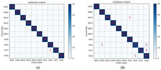 The confusion matrix for SMoCo and labeled pretraining with the best diagnostic performance is plotted as shown in Figure 11. SMoCo only misclassified one sample of KI17 as KI16, which is consistent with the results visualized in Figure 9. The interval between KI17 and KI16 is relatively close, which may cause errors in the classification plane due to the special training samples. Nonetheless, our SMoCo outperforms labeled pretraining in every category.