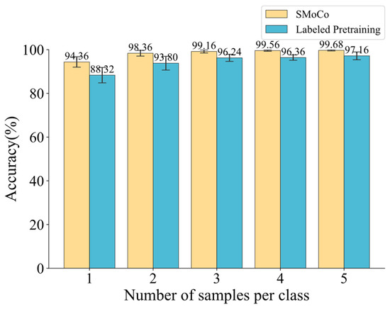The diagnostic accuracy of SMoCo in the case of fewer samples is also further explored by selecting the best performing SMoCo and labeled pretraining as a comparison. For the training set, a total of 5 groups of samples from 1 to 5 per class were used to explore the results, as shown in Figure 12. It can be seen from Figure 12 that SMoCo is far better than labeled pretraining in all cases. SMoCo can achieve 99.16% accuracy with only 3 samples per class and its accuracy only drops more in the case of one sample per class. It is demonstrated that our method has strong performance and robustness for diagnosis in limited data.