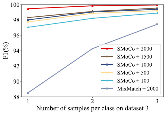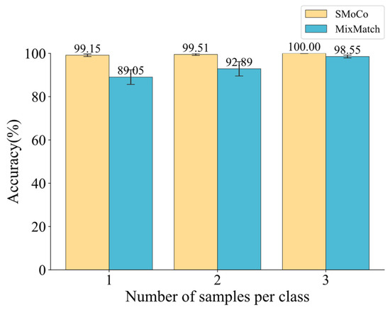 To further explore the effectiveness of SMoCo, MixMatch is also used as a comparison, which is the best performing method among the other methods. For the training set of dataset 3, one sample per class to three samples per class are used for training, and the results are shown in Figure 16. SMoCo can achieve a diagnostic accuracy of 99.15% with only one sample per class, which is also consistent with the results of feature visualization. It is proven that SMoCo is efficient and robust in the face of diagnostic tasks of different devices, which greatly reflects its superiority. In the case of extremely limited data, MixMatch’s diagnostic accuracy drops sharply. This is due to the lack of a stable and efficient feature extractor, and it will encounter the common problem of deep learning, that is, the performance will be greatly reduced when the amount of data is extremely limited.