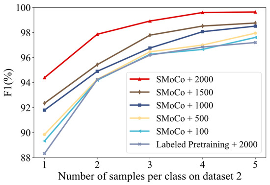 To further explore the sensitivity of SMoCo to the size of the unlabeled pre-training dataset, in this section, five different data volumes of 2000, 1500, 1000, 500, and 100 for each class are used for self-supervised learning on unlabeled dataset 1. After the self-supervised training is completed, all feature extractors are used to perform fault diagnosis on the labeled dataset 2 and dataset 3, respectively. In addition, to further explore their performance with different numbers of labeled training sets, this paper varies the number of samples per class from 1 to 5 for the training set of dataset 2 and from 1 to 3 for dataset 3. For each dataset, an additional method that performs the best except SMoCo in Section 4.2 and Section 4.3 is performed as a comparison. Finally, to better evaluate their diagnostic performance, the F1 score is used as the evaluation criterion [33], and the results are shown in Table 8, Figure 17, Table 9, and Figure 18. Where SMoCo + 2000 means self-supervised learning using 2000 unlabeled samples per class in dataset 1, the meaning of SMoCo + 1500, etc. can be deduced accordingly. Labeled pretraining + 2000 means pre-training with labels using 2000 samples per class in dataset 1. MixMatch + 2000 means semi-supervised learning using both the 2000 unlabeled samples per class in dataset 1 and the labeled target diagnostic dataset.