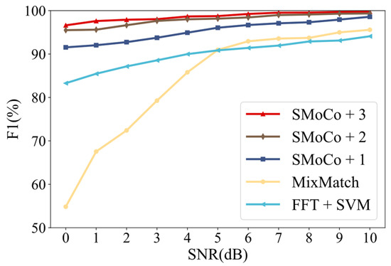 In this section, noise stress tests are carried out to demonstrate the robustness and effectiveness of SMoCo with different signal-to-noise ratio (SNR) values on dataset 3. As a comparison, MixMatch and FFT + SVM are also used to perform diagnosis on dataset 3 with 3 samples per class at different noise levels, which are the best performing methods except SMoCo. SMoCo and MixMatch both use the full unlabeled dataset 1, i.e., 2000 samples per class. In this paper, we also further increase the difficulty of the experiment by training SMoCo from 1 sample per class to 3 samples per class of the labeled datasets, to verify the robustness of SMoCo under severe conditions, which are denoted as SMoCo + 1, SMoCo + 2, and SMoCo + 3. The evaluation criterion is the F1 score, and the results are shown in Table 10 and Figure 19.
