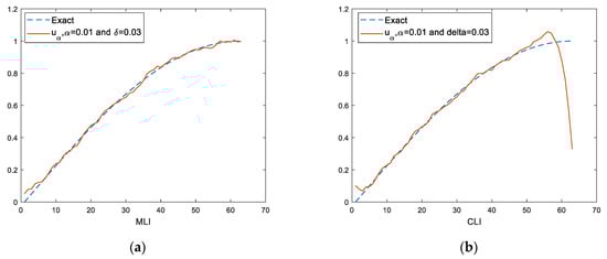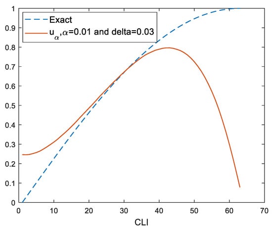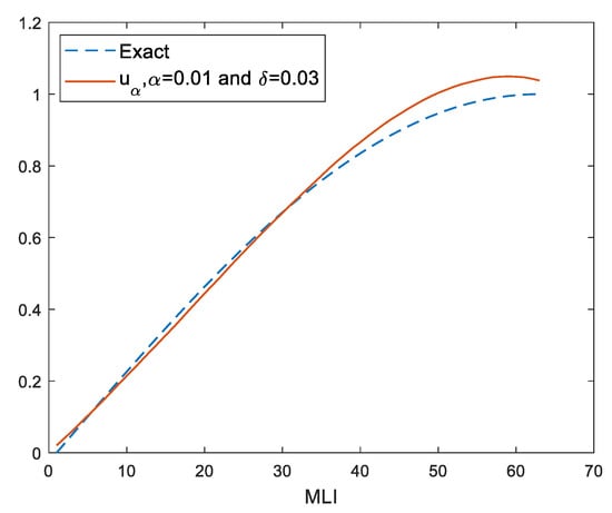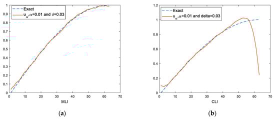 Considering the above problem, we need to find the function . The real solution, and the  represented the input function, where the ,  and . In [], we prepared a case study using MATLAB code. First of all, the discretization algorithm was applied to obtain the operator, and by using , we obtained the vector . We then add some noise, as explained in the code for obtaining the vector . Finally, we computed the SVD for operator , and used it in the MLI and CLI algorithms to obtain the approximation solutions .