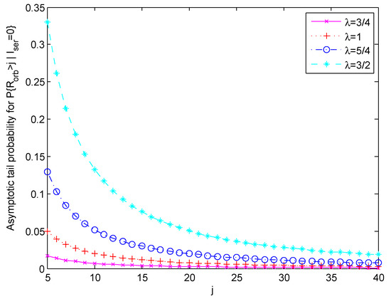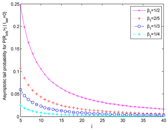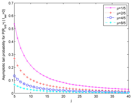 Finally, we show, in Figure 3, the trend of the change for the tail asymptotic probability , as a function of the retrial rate . Specifically, we set , , and . The four curves correspond to the following four different retrial rates: , respectively.