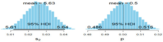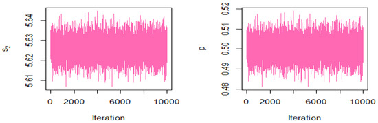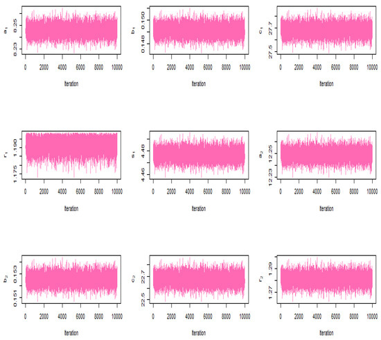 In addition, Bayesian credible interval estimates of the parameters are obtained numerically using Markov chain Monte Carlo (MCMC) techniques. That is, samples are simulated from the joint posterior distribution in Equation (12) using the Metropolis–Hasting algorithm to obtain the posterior mean values of the estimates of the parameters by MCMC.