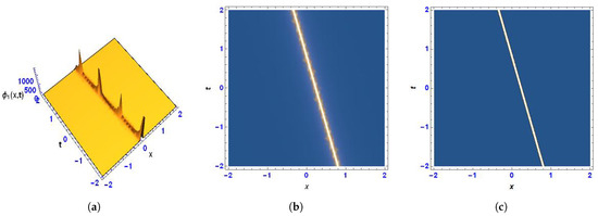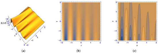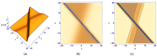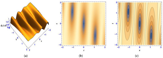 (a) Three-dimensional, (b) density, and (c) contour images of (14) under the values .