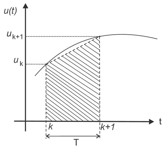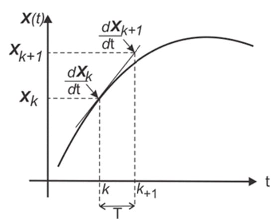 This is the simplest method to solve a first-order differential equation. The interval is divided into subintervals obtaining a set of discrete points kn as shown in Figure 4, where interval is the sampling period. At k exists a value Xk; considering that T is very small, an approximation of Xk+1 can be calculated considering a local approximation equivalent to the local slope of Xk, according to