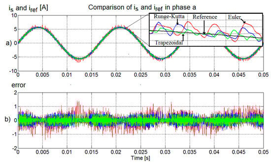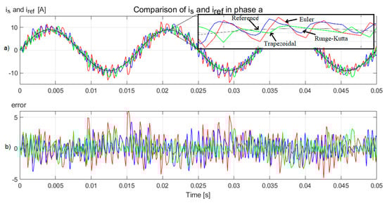 To validate the impact of the use of the numerical approximations in the predictive controller model under different conditions, the sampling period was modified to 100 µs. In Figure 11a, the comparison between the reference current and the line current in phase a obtained from Euler, Runge–Kutta, and first-order trapezoidal methods is shown; Figure 11b shows the error. It can be seen that the error increases with the sampling period, but the use of the trapezoidal approximation allows a better performance.