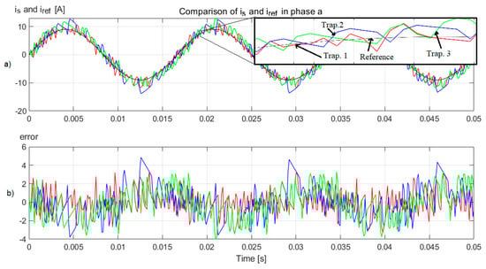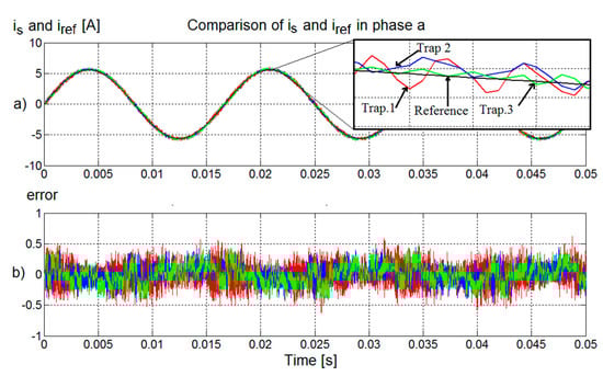 In Figure 12a, a comparison between the current reference and current in phase a is presented when first-, second-, and third-order trapezoidal approximations are used in the predictive model for a Ts = 100 µs. Table 3 reveals that the MSE increases with Ts, but the first-order trapezoidal approximation allows the minimum MSE.