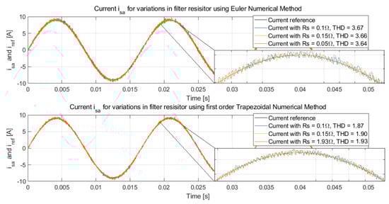 To validate the performance of the controller under dynamical changes in nominal values, some parameters were modified in one phase to unbalance the system. Figure 15 shows the line currents in phase a obtained with Euler and first-order trapezoidal approximations in the controller for a line resistor variation of ±50%. It can be seen that the control action compensates for the unbalance to continue tracking the reference current, and the THD is not significantly altered.