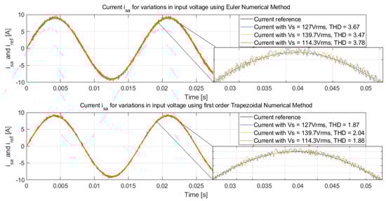The line currents in phase a obtained with Euler and first-order trapezoidal approximations for an input voltage variation of ±10% are presented in Figure 16. The control action compensates for the variation with the turning on and turning off times in the switching devices, allowing tracking of the reference current without a significant impact on the THD of the input current.