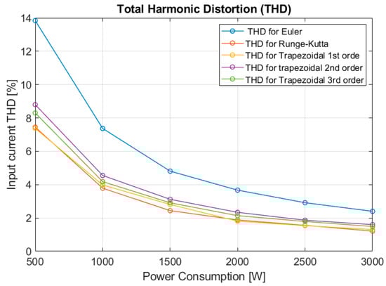 A better-approximated solution of the mathematical model is reflected in the THD obtained in the supply currents. Figure 17 contrasts the obtained THD when different numerical approximations are used; it can be seen that the Runge–Kutta and first-order Trapezoidal methods generate a low THD, but the Runge–Kutta method requires a higher computational cost. It can also be observed that the use of second- and third-order trapezoidal methods increases the THD in contrast with the first-order trapezoidal method, because the supply currents are deformed a little more.