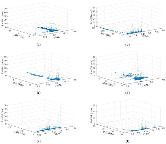3D in situ variation of rainfall, SMS, and VSMC at 1.5 m depth (a) HWS 1 (b) HWS 2 (c) HWS 3 (d) HWS 4 (e) HWS 5 (f) HWS 6.