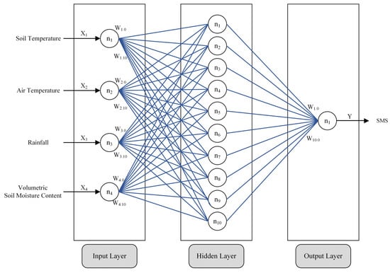 As illustrated in Figure 6, this experiment used a single hidden-layer ANN-BR-backpropagation model. Back-propagation is a subclass of the ANN-BR model. The structure comprises three layers: an input layer, a hidden layer, and an output layer. Weights are used to connect neurons at various levels. The values between neurons connect the weights. As a result, neurons generate output signals in which the sum of the input signals is ignored via a transfer function [45,47].